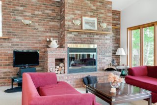 - Bright living area with wood-burning fireplace